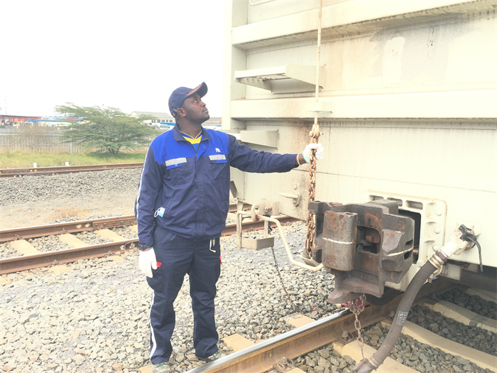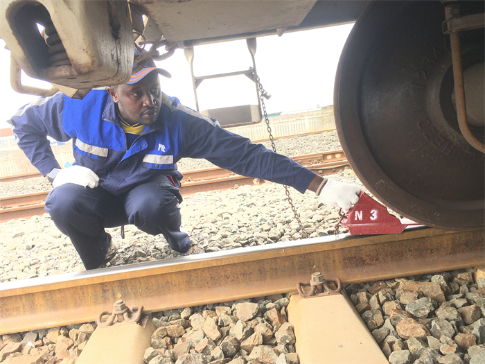 皮顿·恩霍洛日在检查停留车辆防溜措施。非洲之星铁路运营公司供图