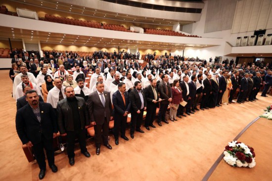 1月9日,议员在伊拉克首都巴格达出席新一届国民议会首次会议。伊拉克新一届国民议会9日下午举行首次会议,上届议长穆罕默德·哈布希再次当选议长。新华社发(伊拉克国民议会供图)