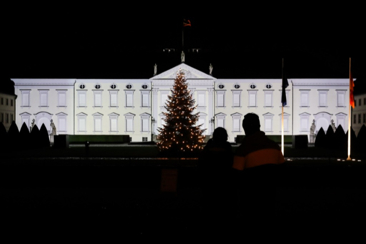 2020年12月17日,在德国首都柏林,两名参观者观看被灯光点亮的德国总统府。新华社记者单宇琦摄