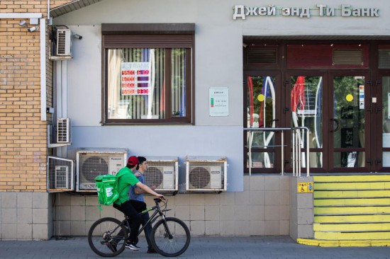 6月29日,在俄罗斯首都莫斯科,送餐员经过一家银行的汇率显示屏。(新华社记者白雪骐摄)