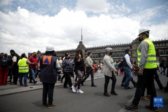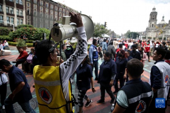 9月19日,在墨西哥首都墨西哥城,民防人员引导室外避险的民众。新华社发(弗朗西斯科·卡涅多摄)