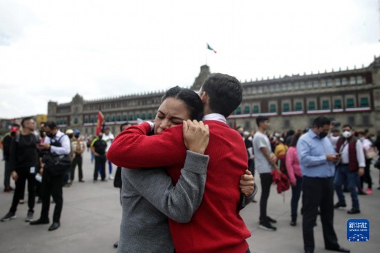 9月19日,在墨西哥首都墨西哥城,室外避险的人们相互安慰。新华社发(弗朗西斯科·卡涅多摄)