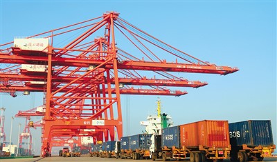 日前,在江苏连云港港,货轮进行装卸作业。 |