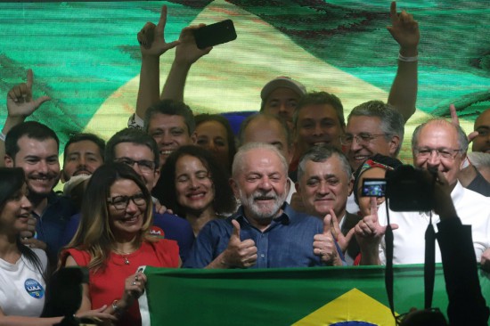 2022年10月30日,劳工党候选人、前总统卢拉(前中)在巴西圣保罗参加大选庆祝活动。卢拉在当天举行的巴西大选第二轮投票中获胜,当选新一任巴西总统。新华社发(拉赫尔·帕特拉索摄)