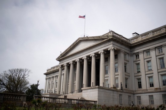 这是2020年3月27日在美国首都华盛顿拍摄的美国财政部大楼。新华社记者刘杰摄