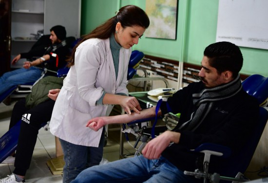 2月8日,民众在叙利亚首都大马士革一处献血中心献血。新华社发(阿马尔·萨法尔贾拉尼摄)