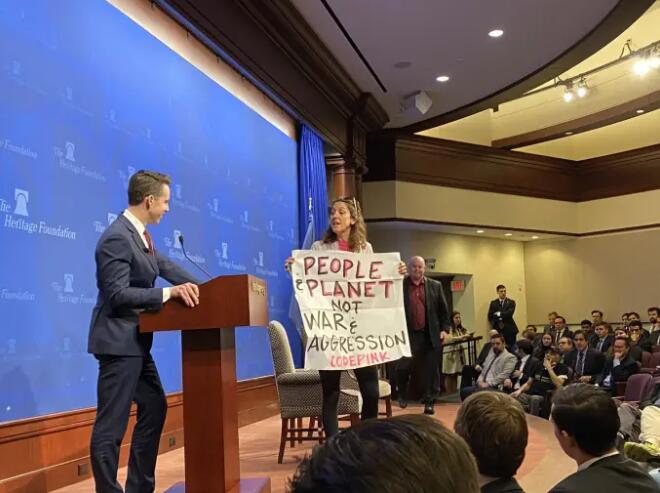 CSPAN发布在社交媒体平台推特上的视频画面显示,在霍利发表演讲的过程中,一名女性抗议者走上了讲台,举起一幅自制海报,向台下观众展示,随后一名安保人员将该女子带离演讲现场。而据《独立报》报道,女子手持的海报上写着“(要)人类(和)地球,不要战争(和)侵略”。