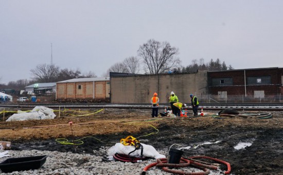2月14日,在美国俄亥俄州东巴勒斯坦镇,挖掘机在事故现场处理污染土壤。新华社发(章焱飞摄)