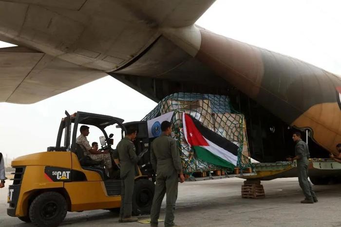 9月13日,工作人员在约旦安曼一军用机场搬运送往利比亚的援助物资。新华社发(穆罕默德·阿布·古什摄)