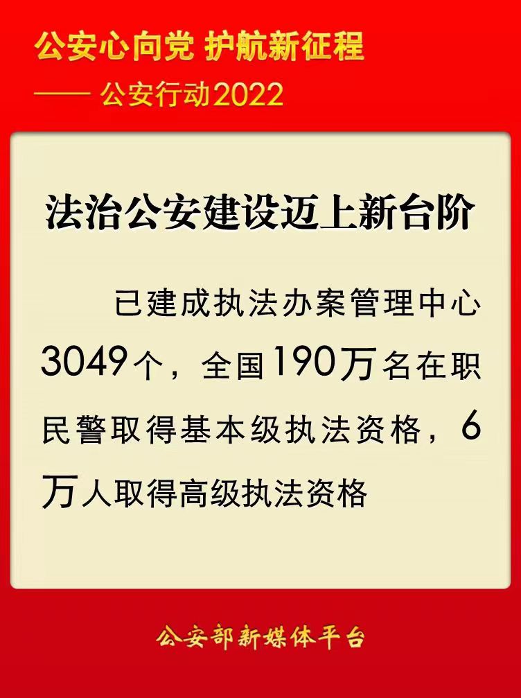 人民网北京1月6日电 (记者郝萍、梁秋坪)记者从公安部获悉:2022年,全国公安机关聚焦法治公安建设目标,不断深化执法规范化建设,持续推动提升公安工作法治化水平和执法公信力,法治公安建设迈上新台阶。截至目前,已建成执法办案管理中心3049个,全国190万名在职民警取得基本级执法资格,6万人取得高级执法资格。