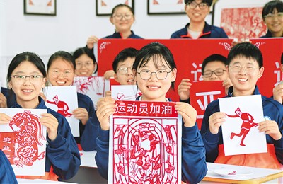 9月21日,江苏省海安市墩头镇初级中学,学生们展示创作的迎亚运剪纸作品。 |