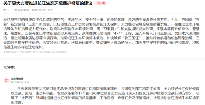为此,生态环境部回复留言表示,近年来,生态环境部会同有关部门和沿江省市,全力打好长江保护修复攻坚战。