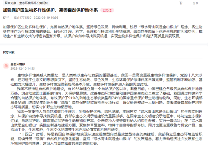 对此,生态环境部回复留言表示,生物多样性关系人类福址,是人类赖以生存与发展的重要基础。我国一贯高度重视生物多样性保护,党的十八大以来,我国坚持生态优先、绿色发展,生态环境保护法律体系日臻完善、监管机制不断加强、基础能力大幅提升,生物多样性治理新格局基本形成,生物多样性保护进入新的历史时期。