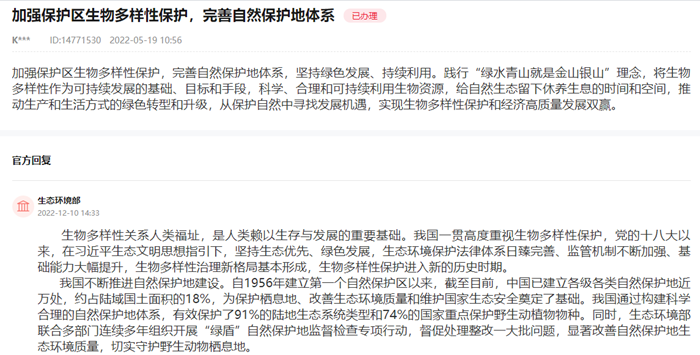 有网友在人民网“领导留言板”上留言建议,加强保护区生物多样性保护,完善自然保护地体系,坚持绿色发展、持续利用。推动生产和生活方式的绿色转型和升级,从保护自然中寻找发展机遇,实现生物多样性保护和经济高质量发展双赢。