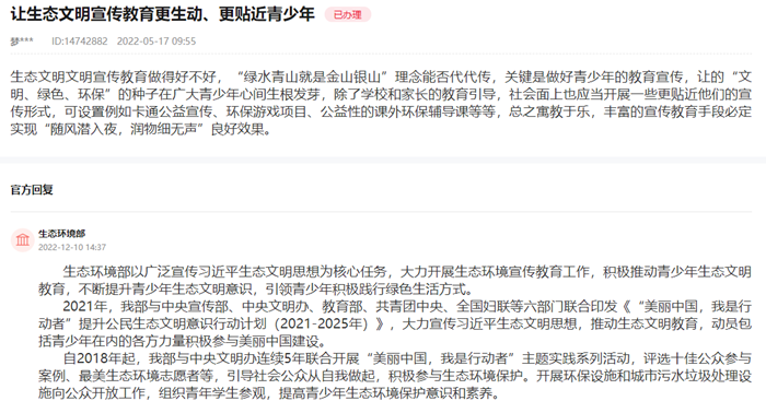对此,生态环境部回复留言时表示,近年来,生态环境部大力开展生态环境宣传教育工作,积极推动青少年生态文明教育,不断提升青少年生态文明意识,引领青少年积极践行绿色生活方式。