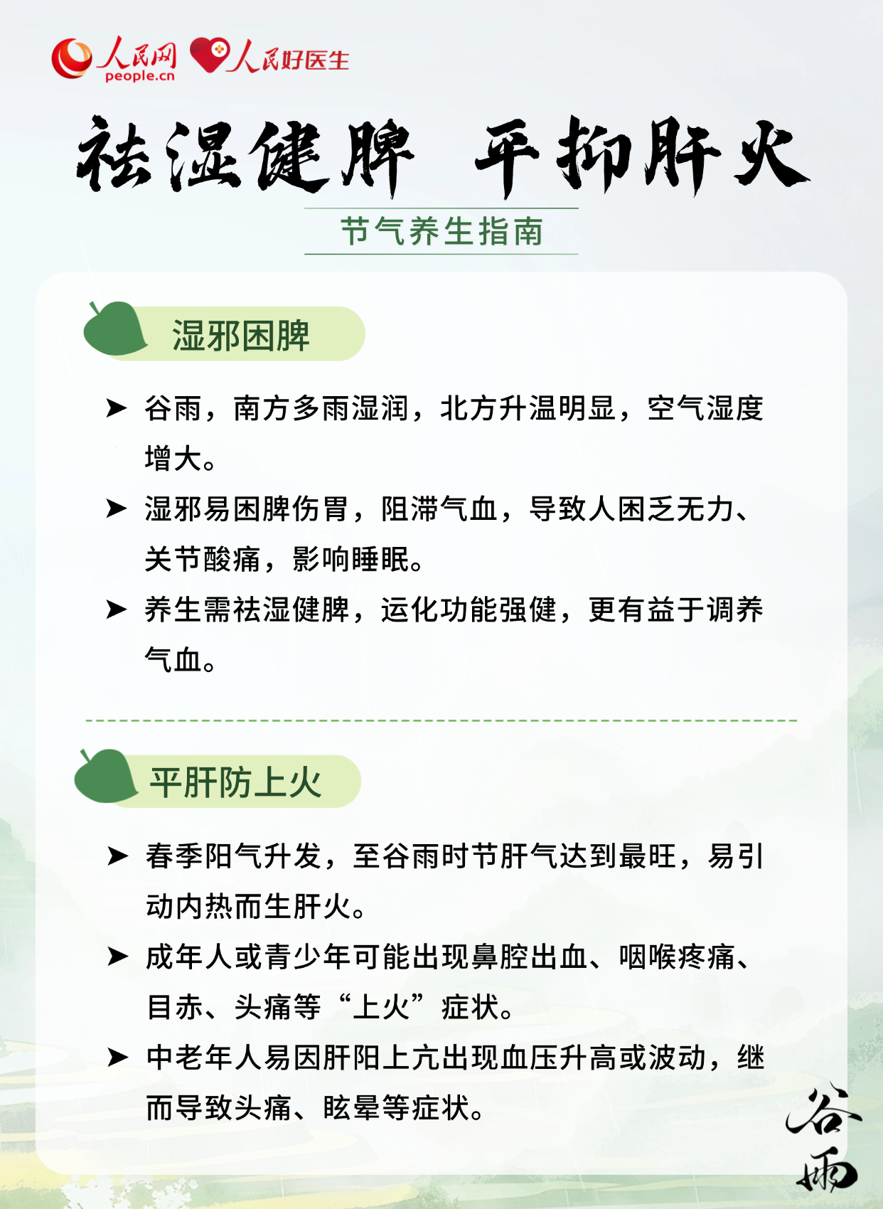 谷雨是春夏之交的关键转折期,气温回升快、雨水增多,湿热交织成为气候主旋律。此时养生的核心在于健脾祛湿与柔肝防风,既要防范外湿入侵关节皮肤,也要疏解内湿困脾上火。