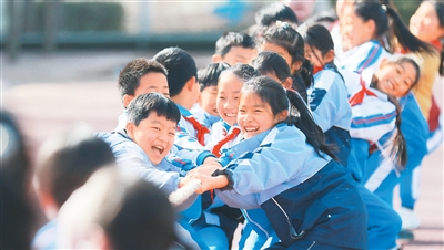 图为在山东省高密市恒涛实验小学,小学生在进行拔河比赛。