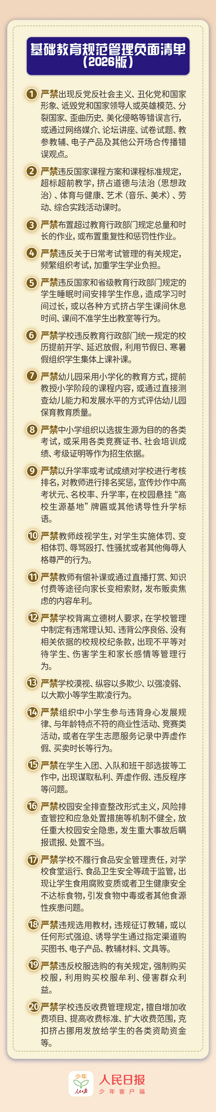 通知提出20条负面清单,针对影响政治安全、影响教育公平、影响学生身心健康、造成课业负担过重、师德失范、侵害群众利益等六类问题,明确禁止相关行为。