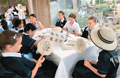 在澳大利亚阿德莱德动物园举办的“国际中文日”活动中,学生写汉字“熊猫”并绘画。 |
