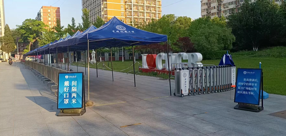 面对炎热天气,中国地质大学(北京)专门在核酸检测等候区建立百余米长凉棚通道,改善师生检测环境。北京市教委供图