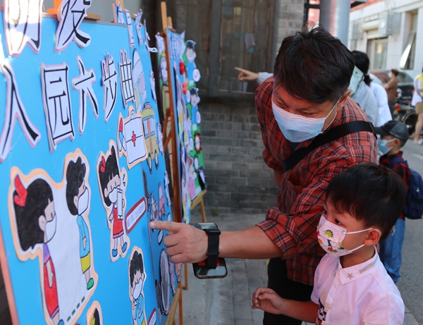 北京市第一幼儿园将疫情防控作为开学第一课的主题,带领孩子们积极参与到防疫儿歌互动游戏中,还通过趣味体育运动、观看防疫主题展板等,在边看边玩边做的过程中了解防疫知识,增强防疫意识。