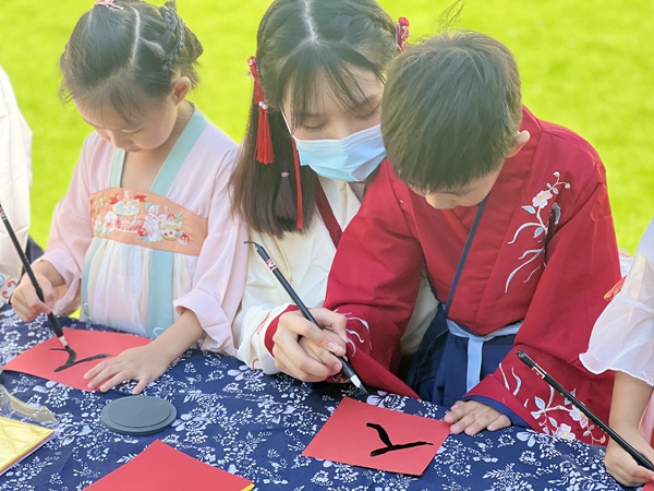 在春江幼儿园,小朋友们认真地学写人生中的第一个字——“人”。“人”字笔画虽简单易学,但却象征着为人要心胸坦荡、顶天立地的重要意义。“人”字完成后,孩子们拿起小鼓槌在“一鸣惊人,击鼓增志”仪式环节,铆足劲儿击鼓三声,表明远大志向,为自己的人生鼓劲加油。