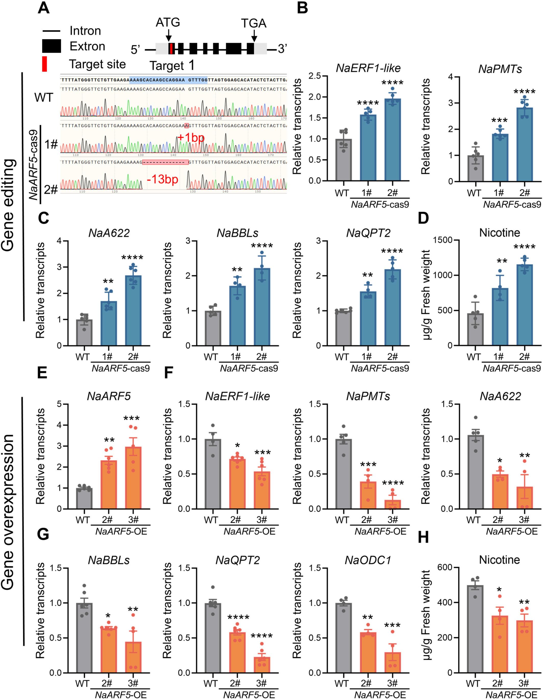 敲除NaARF5基因的实验,则更直观地证明了这一点。烟草叶片中尼古丁含量比正常植株增加了1.6—2.5倍;而过量表达生长素反应因子,则会显著降低尼古丁含量。这意味着,它是生长素抑制尼古丁合成的核心介导者。