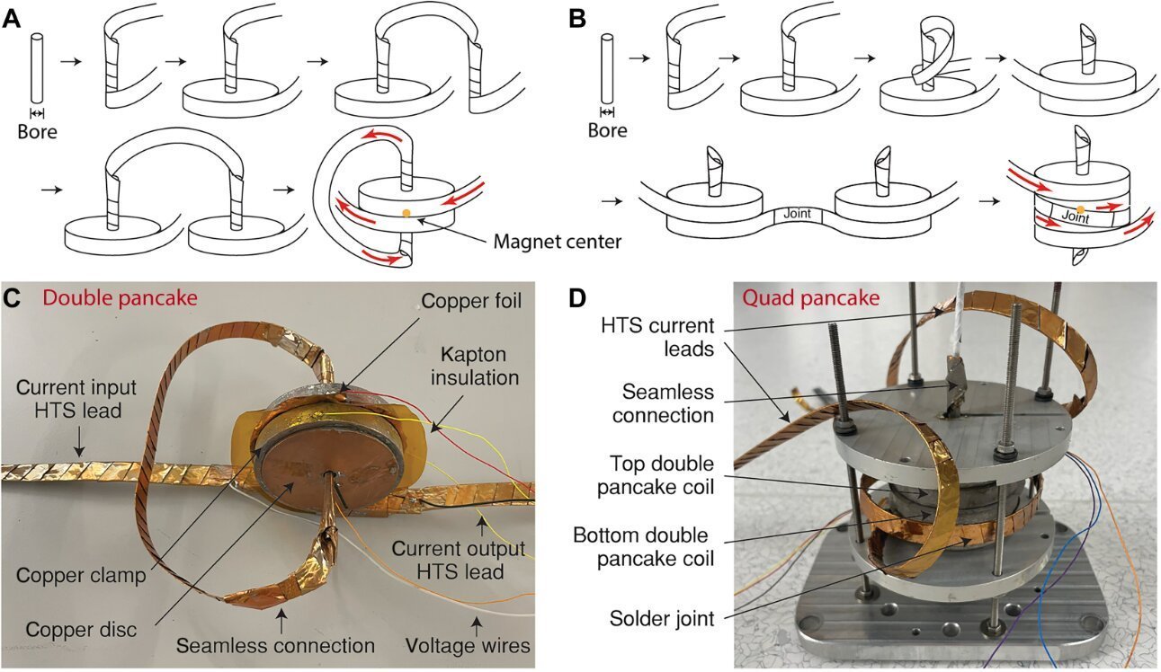 研究人员将稀土钡铜氧化物(REBCO)超导带材绕制成扁平的盘状线圈(被称为“pancake”线圈),再将多个线圈堆叠成整体结构。这种设计不仅将磁场集中在更小体积内,而且相比传统设计所需的带材长度也大幅减少。