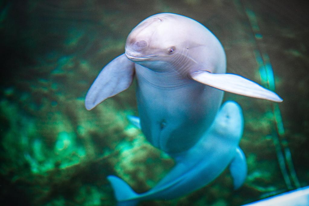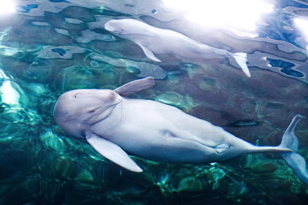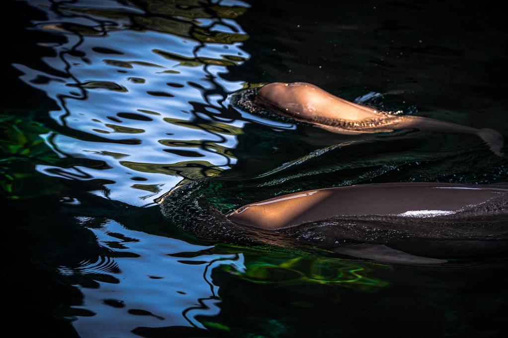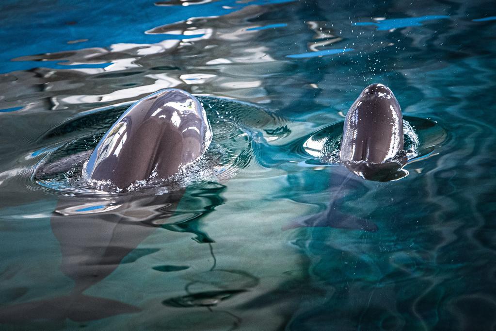 时而下潜水底、时而探出水面、时而畅游水中……在中国科学院水生生物研究所白鱀豚馆,长江江豚幼豚“F9C22”正在母亲“福久”的陪伴下嬉戏,母女如影随形、其乐融融。