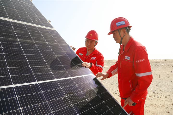 塔里木油田员工现场检查光伏板安装情况。牛作杰 摄