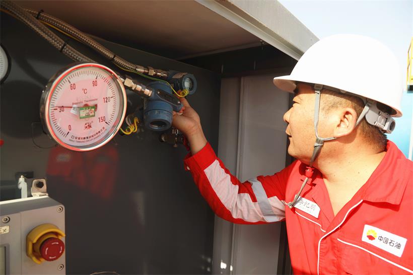 塔里木油田技术人员现场检查加热炉仪表参数。牛作杰 摄