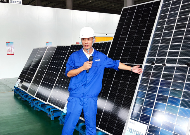 图为企业负责人向记者介绍光伏玻璃产品应用。人民网记者孙博洋摄