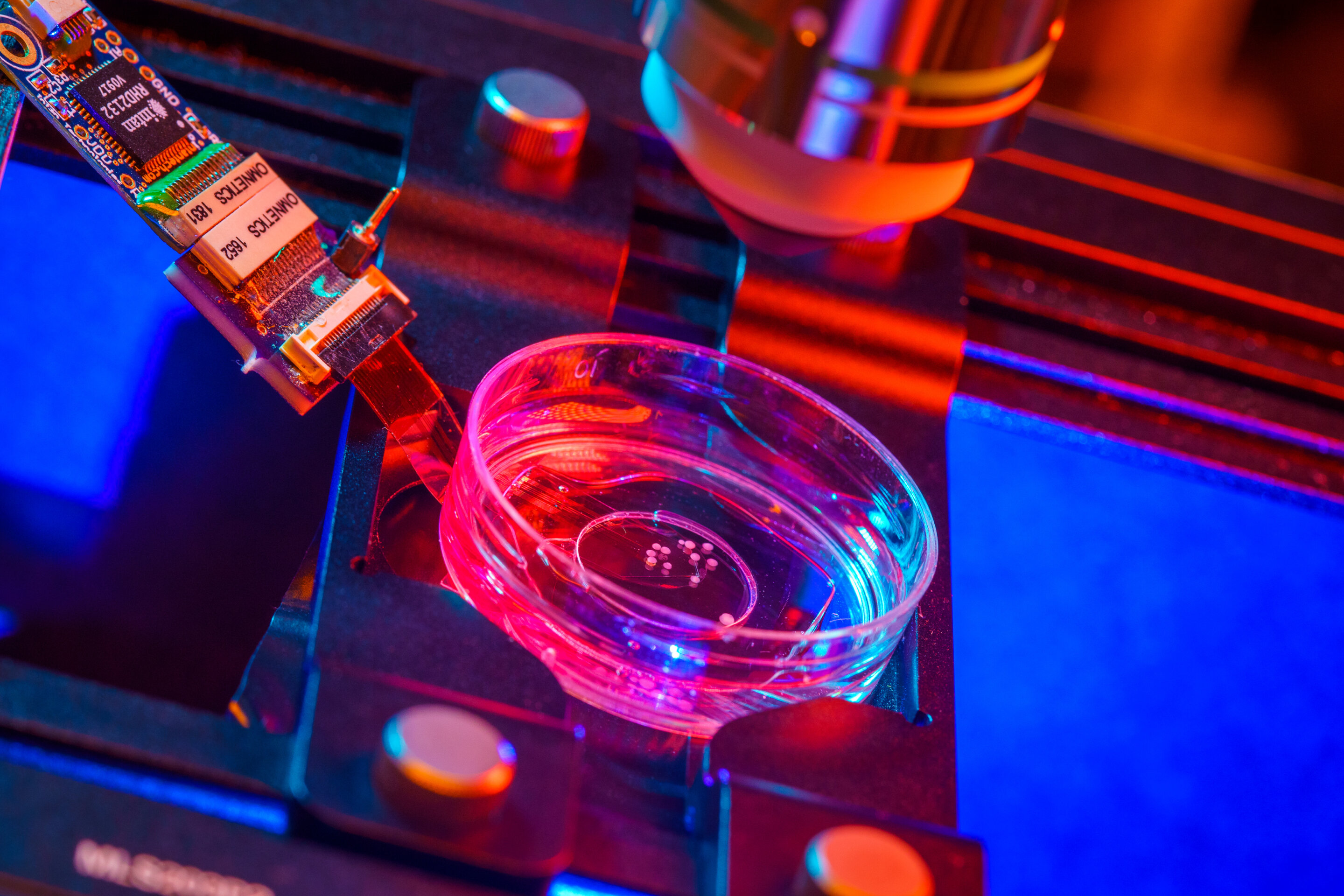 研究人员开发了将透明石墨烯制成的微电极阵列与双光子成像相结合的实验,双光子成像是一种可以为厚度达一毫米的活组织成像的显微技术。图片来源:大卫·贝洛特/加州大学圣地亚哥分校