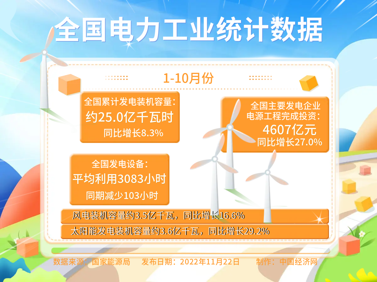 中国经济网北京11月23日讯(记者王婉莹)记者从国家能源局获悉,11月22日晚间,国家能源局发布1-10月份全国电力工业统计数据。截至10月底,全国累计发电装机容量约25.0亿千瓦,同比增长8.3%。
