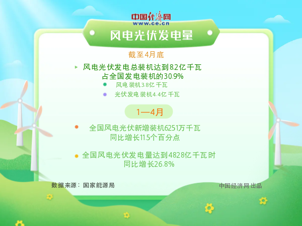 今年1—4月,全国风电光伏发电量达到4828亿千瓦时,同比增长26.8%,占全社会用电量的17.2%,较去年同期增长3个百分点。