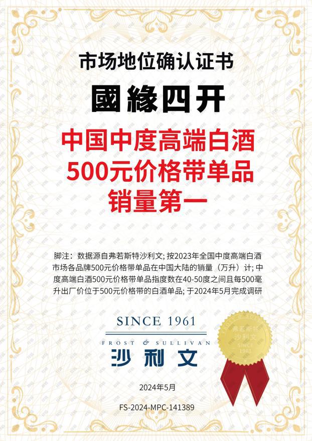 中国中度高端白酒500元价格带单品销量第一,“国缘四开”做到了!