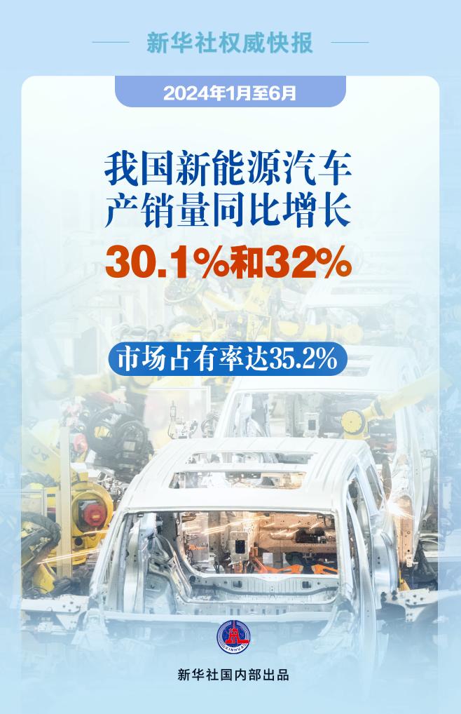 2024年上半年我国新能源汽车产销量同比增长30.1%和32%