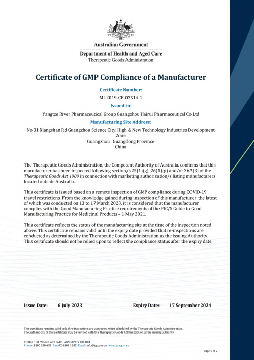 扬子江药业集团:广州海瑞药业车间通过澳大利亚TGA GMP认证