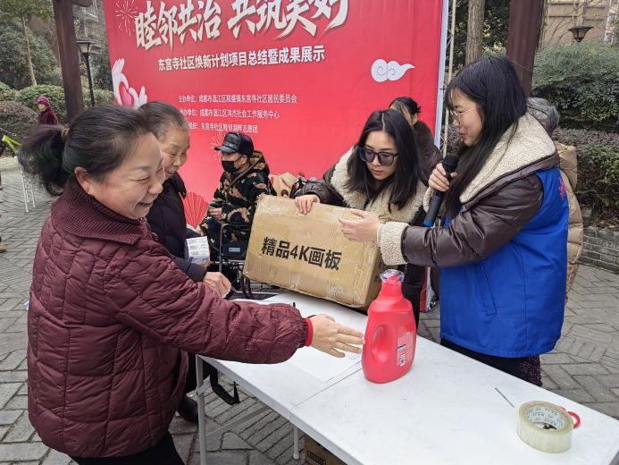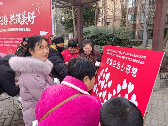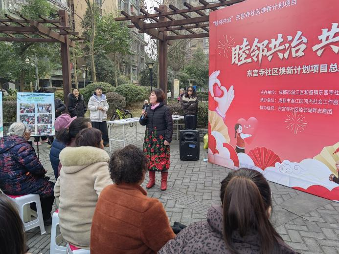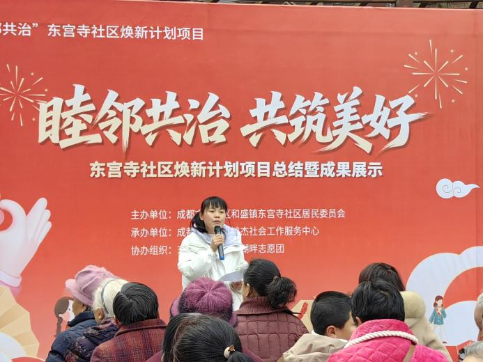 为了破解老旧小区环境整治难、邻里互动少、自治参与弱等痛点,进一步总结东宫寺社区“睦邻共治 共筑美好”焕新计划项目近一年来的实践成果,凝聚邻里共识、激发居民自治热情,2026年1月27日,和盛镇东宫寺社区居民委员会联合成都市温江区鸿杰社会工作服务中心在湖畔湾小区开展了“睦邻共治 共筑美好”东宫寺社区焕新计划项目总结暨成果展示活动。此次活动不仅是对过去一年来社区治理工作的深情回望,更是居民共庆成果、共绘未来的社区嘉年华,标志着社区自治共治精神迈入协同发力、持续深化的新阶段。