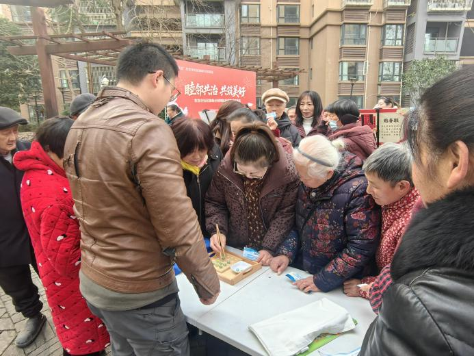 总结环节意犹未尽,更具趣味性与参与感的第二阶段——互动游园与成果展示也热烈开启。第一个打卡点设在成果展示区,居民们需细心从展板中寻找指定答案或关键信息,在互动中加深对项目成果的记忆与理解。移步至巧手夹弹珠游戏区,这里充满了挑战与欢笑:居民们手持筷子,全神贯注地将滑溜的弹珠从一个碗夹到另一个碗,考验着手眼协调与耐心,现场加油声、欢呼声此起彼伏。
