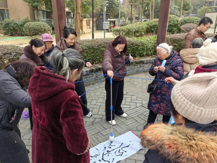 最考验团队协作的当属“同心‘神笔马良’”环节:五到六位居民共同拉住连接着大毛笔的数根绳子,通过默契配合,在铺开的白纸上协同书写出“睦邻”“共治”等饱含寓意的大字。一笔一划间,是力量的均衡把控,更是邻里间的心灵相通,当共同完成的工整字样呈现在眼前时,每个人心中都油然而生成就感与团队归属感。集满三个印章的居民,兴高采烈地前往物资领取处,兑换一份象征参与与荣誉的手帕纸作为纪念,灿烂的笑容洋溢在每个人的脸上。