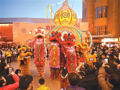 游客在甘肃省敦煌夜市观看舞狮表演。 |