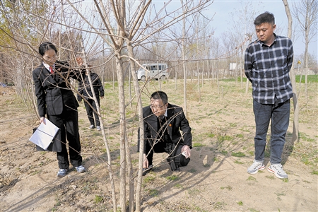 法官勘验五角枫树苗受损情况。