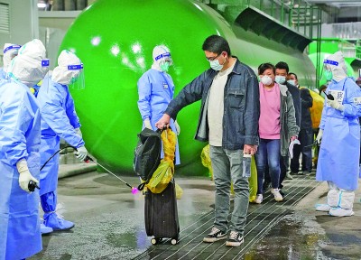 4月14日,国家会展中心(上海)方舱医院首批322名患者解除隔离医学观察,顺利出舱。图为当日,在国家会展中心(上海)方舱医院,医护人员对出舱患者的行李进行消毒。新华社记者 丁汀摄