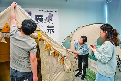 浙江宁波市北仑区一家户外用品企业内,几名年轻员工在测量一件帐篷样品的数据。新华社发