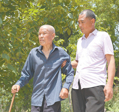谢来成(右)搀扶鲁忠泰在户外散步。 |