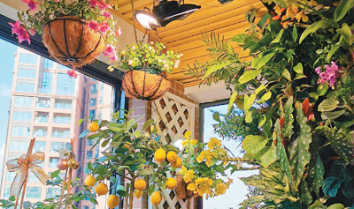 阳台朝向为西北的钟柳家,购买了补光灯来为植物补充光照。“因为晚上亮灯容易招蚊虫和扰民,我们用智能遥控,每天早上9点补光灯自动开启,到下午5点自动关闭。最近深圳多雨,补光的效果很好。”钟柳说,她的家人还设计了一套绿植墙和鱼缸共用的水循环系统,具体来说,将鱼缸里的水抽到绿植墙顶部,可以灌溉绿植,种植盆里加了硝化菌,渗下去的水可以饲养鱼虾,而鱼虾粪便可做植物肥料,如此循环往复,还为鱼虾提供了氧气,一举多得。