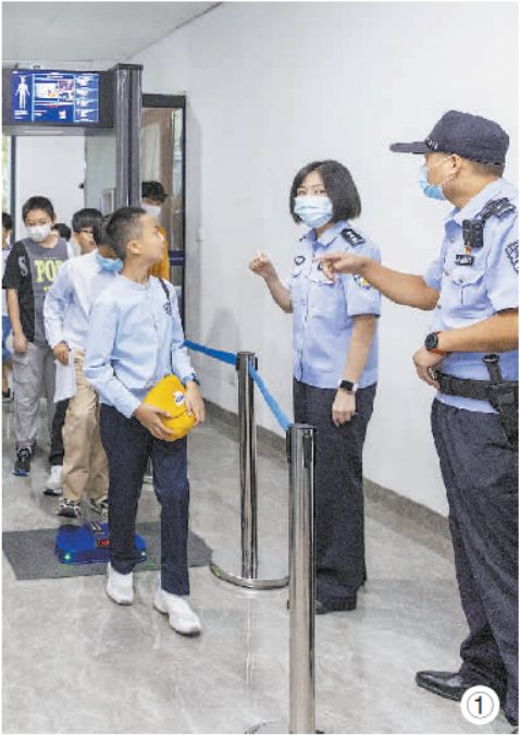 图① :在安检中心,小朋友们向法警询问安检设备的用途。
