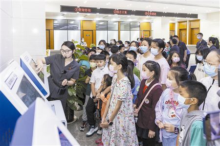 图② :法官给孩子们演示诉讼自助服务终端等智能设备操作。