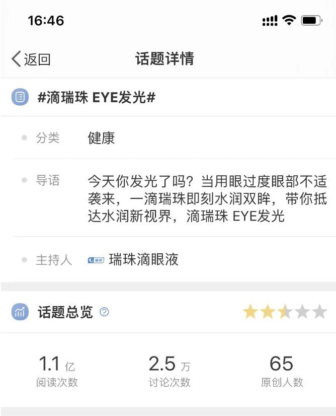 “连续开车导致眼睛干涩”“加班看一天电脑屏幕眼睛异常疲惫”“晚上关灯追剧看综艺眼睛快废了”……话题上线后,瞬间引发热议。截至目前,微博#滴瑞珠EYE发光#话题浏览量达1亿次,引发数以万计的内容讨论次数,掀起了有实效的传播“后浪”,实现话题性传播。